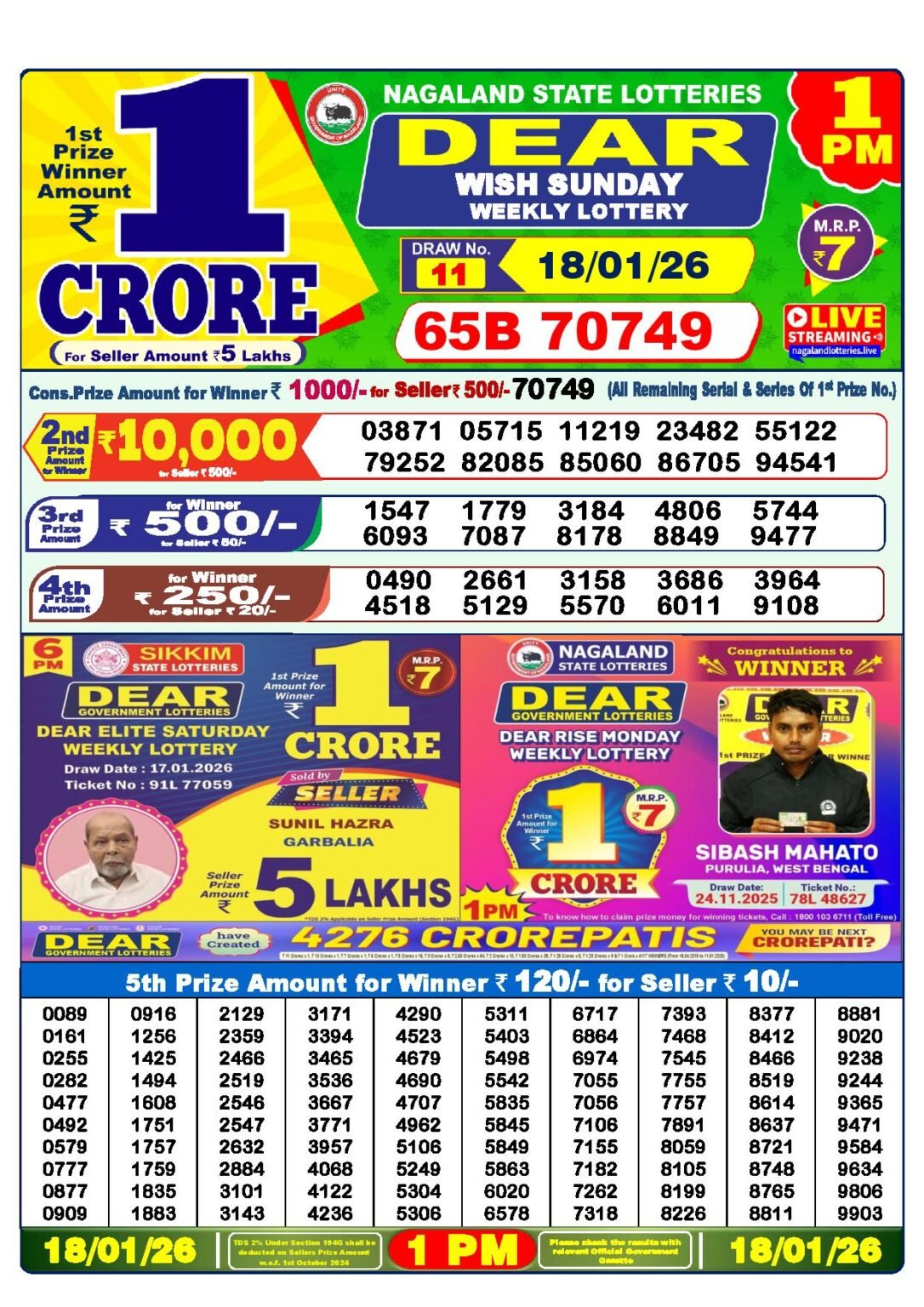 The Nagaland State Dear Lottery Result Today is declared at 1 PM on 18 January 2026 for the Dear Wish Morning Sunday draw.